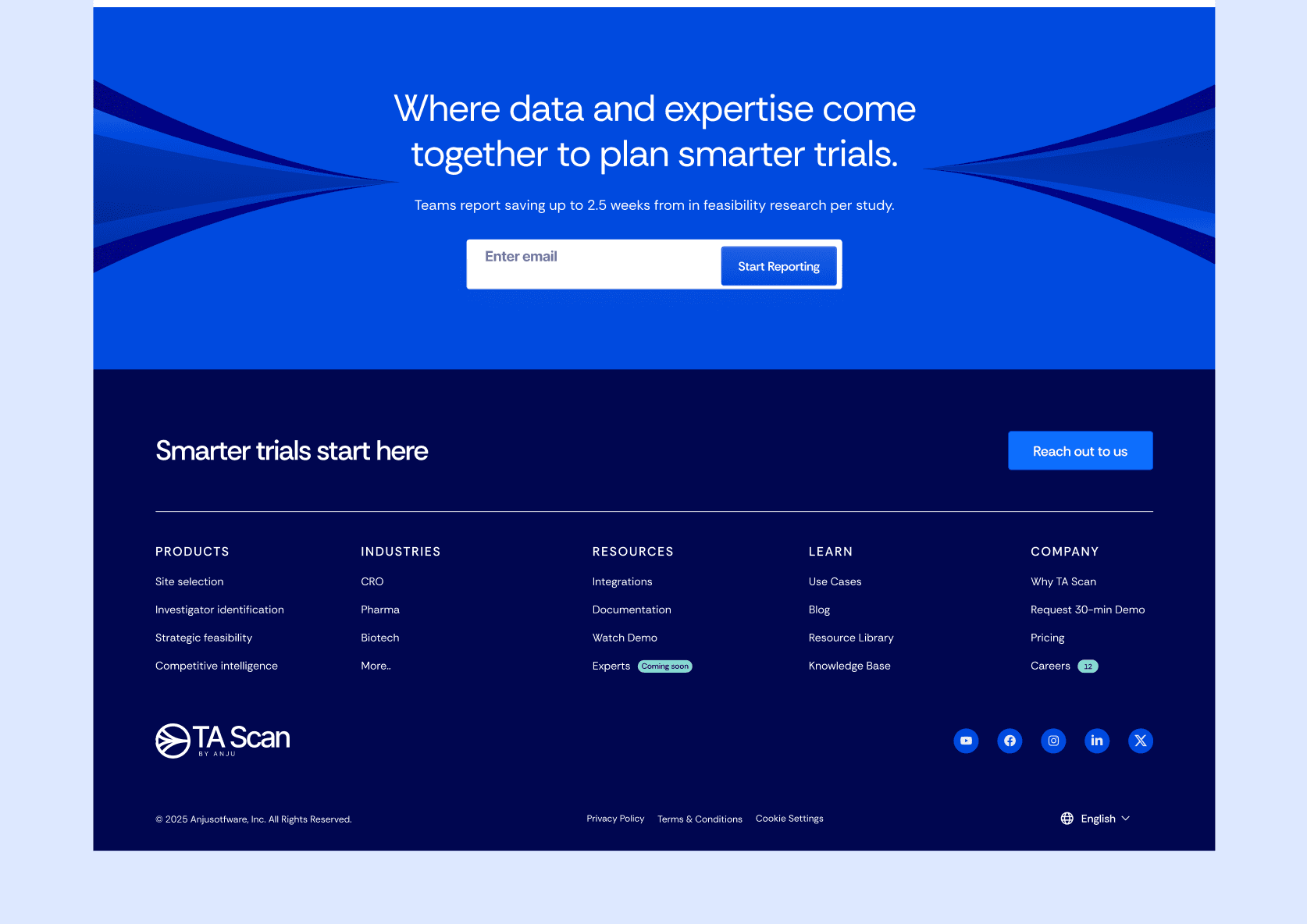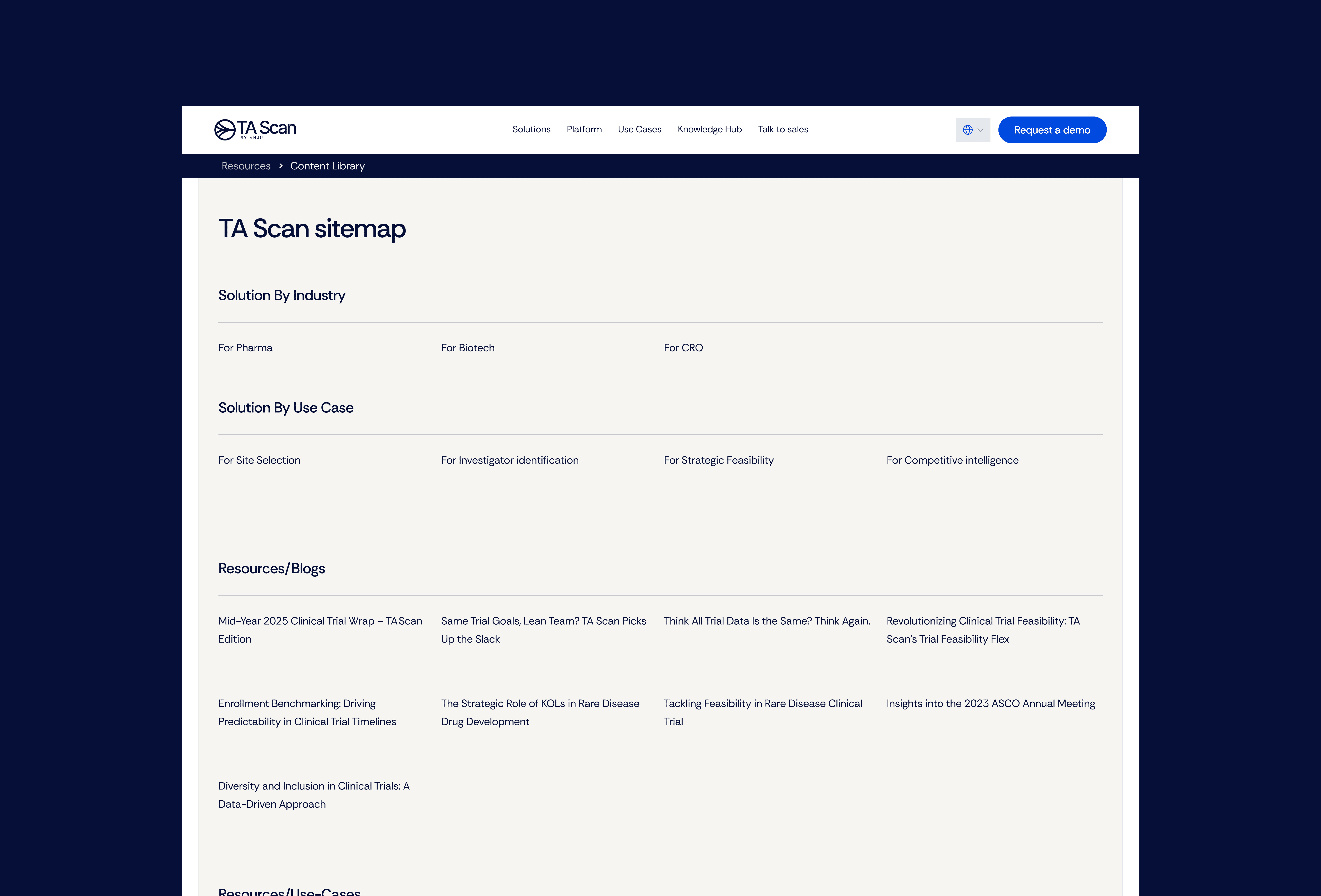 TA Scan, a division of Anju Software, needed to break free from their parent company's crowded, multi-division website. As a sophisticated Clinical talent acquisition scanning tool, TA Scan was getting buried in the noise, making it nearly impossible for prospects to understand the product's value or take action. With a strategic pivot from B2B-only to include B2C and freemium offerings on the horizon, Standard templates and quick fixes weren't going to cut it. A dedicated site that could actually convert visitors and grow with them. No templates, no shortcuts, just a custom build that gets the job done. Scope & Structure: 28+ custom pages including homepage, solutions, features, use cases, pricing (B2B/B2C models), demo booking, contact, login portal, and a comprehensive blog/resources section Strategic architecture designed to highlight core features and keywords for SEO while supporting their freemium model Flexible framework built to accommodate ongoing branding work and future section additions without requiring a rebuild